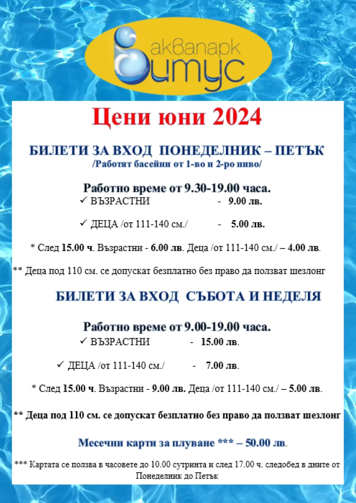 При неблагоприятно време е възможна промяна в работните дни и часове на аквапарка!